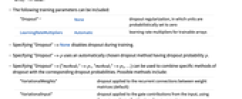 "Dropout" None dropout regularization, in which units are probabilistically set to zero LearningRateMultipliers Automatic learning rate multipliers for trainable arrays - Specifying "Dropout"->None disables dropout during training.