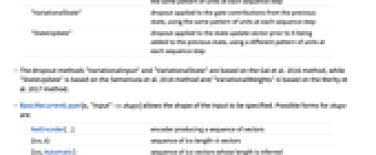 "VariationalWeights" dropout applied to the recurrent connections between weight matrices (default) "VariationalInput" dropout applied to the gate contributions from the input, using the same pattern of units at each sequence step "VariationalState" dropout applied to the gate contributions from the previous state, using the same pattern of units at each sequence step "StateUpdate" dropout applied to the state update vector prior to it being added to the previous state, using a different pattern of units at each sequence step - The dropout methods "VariationalInput" and "VariationalState" are based on the Gal et al. 2016 method, while "StateUpdate" is based on the Semeniuta et al. 2016 method and "VariationalWeights" is based on the Merity et al. 2017 method.
