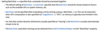 - BatchSize can be specified when evaluating a net by writing net[input,BatchSize->n]. This can be important when GPU computation is also specified via TargetDevice->"GPU", as memory is typically more limited in this case.