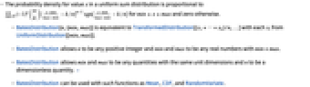 and zero otherwise. - BatesDistribution[n,{min,max}] is equivalent to TransformedDistribution[(x1+⋯+xn)/n,…] with each xi from UniformDistribution[{min,max}].