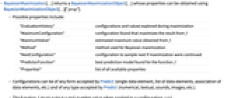 - BayesianMaximization[…] returns a BayesianMaximizationObject[…] whose properties can be obtained using BayesianMaximizationObject[…]["prop"].