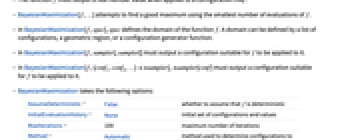- In BayesianMaximization[f,spec], spec defines the domain of the function f. A domain can be defined by a list of configurations, a geometric region, or a configuration generator function.