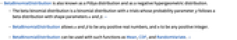 - BetaBinomialDistribution is related to a number of other statistical distributions. As previously mentioned, BetaBinomialDistribution combines features from both BinomialDistribution and BetaDistribution, a fact made precise by observing that ParameterMixtureDistribution[BinomialDistribution[n,p],pBetaDistribution[α,β]] evaluates to BetaBinomialDistribution[α,β,n]. Similarly, DiscreteUniformDistribution[{0,n}] is precisely the same as BetaBinomialDistribution[1,1,n], a fact that subsequently induces qualitative links with UniformDistribution, TriangularDistribution, and PERTDistribution. In a very natural way, BetaBinomialDistribution is related to BetaNegativeBinomialDistribution, and because of the fact that MultinomialDistribution and DirichletDistribution are higher-dimensional analogues of BinomialDistribution and BetaDistribution, respectively, BetaBinomialDistribution can be viewed as a one-dimensional analog of the so-called Dirichlet-multinomial distribution.