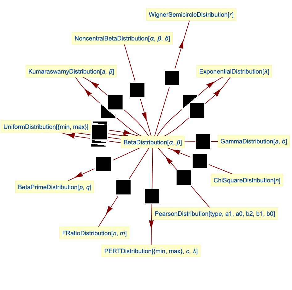 ), PDF[BetaDistribution[1,1],x] is equal to both PDF[UniformDistribution[],x] and PDF[PowerDistribution[1,1],x]. BetaDistribution can also be obtained as transformations of KumaraswamyDistribution and NoncentralBetaDistribution and is closely related to PERTDistribution, PearsonDistribution, ChiSquareDistribution, GammaDistribution, FRatioDistribution, and BetaPrimeDistribution.