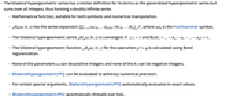 - The bilateral hypergeometric series has a similar definition for its terms as the generalized hypergeometric series but sums over all integers, thus forming a doubly infinite series.