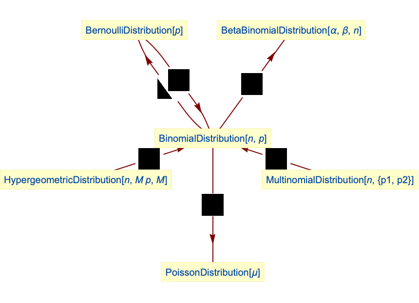 and converges to a discretized PoissonDistribution[p] as n tends to Infinity and p tends to 0, while HypergeometricDistribution[n,p] limits to BinomialDistribution[n,p] as p tends to Infinity. BinomialDistribution is a two-variable case of MultinomialDistribution, is a constituent piece of BetaBinomialDistribution, and has a natural relationship with NegativeBinomialDistribution.