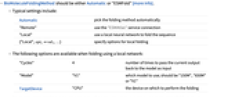 Automatic pick the folding method automatically "Remote" use the "ESMAtlas" service connection "Local" use a local neural network to fold the sequence {"Local",opt1val1,…} specify options for local folding - The following options are available when folding using a local network: