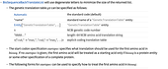 Automatic the standard code (default) "name" standard name of a "GeneticTranslationTable" entity Entity["GeneticTranslationTable",…] "GeneticTranslationTable" entity n NCBI genetic code number "AAAA…" length-64 NCBI amino acid translation string <|"cod1""tran1","cod2""tran2",…|> explicit coding translation table - The start codon specification startspec specifies what translation should be used for the first amino acid in bioseq. If no startspec is given, the first amino acid will be treated as a starting acid only if bioseq is a protein entity or some other specification of a complete protein.