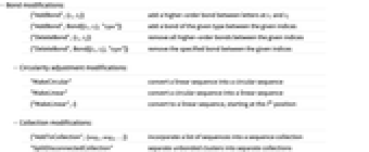 {"AddBond",{i1,i2}} add a higher-order bond between letters at i1 and i2 {"AddBond",Bond[{i1,i2},"type"]} add a bond of the given type between the given indices {"DeleteBond",{i1,i2}} remove all higher-order bonds between the given indices {"DeleteBond",Bond[{i1,i2},"type"]} remove the specified bond between the given indices - Circularity adjustment modifications: