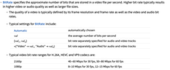 - BitRate specifies the approximate number of bits that are stored in a video file per second. Higher bit rate typically results in higher video or audio quality as well as larger file sizes.
