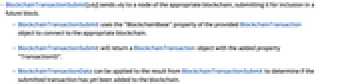 - BlockchainTransactionSubmit[obj] sends obj to a node of the appropriate blockchain, submitting it for inclusion in a future block.