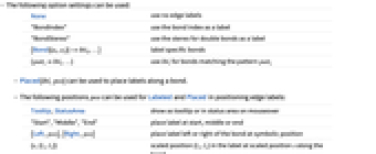 None use no edge labels "BondIndex" use the bond index as a label "BondStereo" use the stereo for double bonds as a label {Bond[{ai,aj}]->lblij,…} label specific bonds {pattilbli,…} use lbli for bonds matching the pattern patti - Placed[lbl,pos] can be used to place labels along a bond.