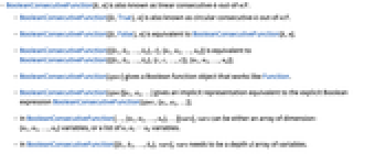 - BooleanConsecutiveFunction[spec][a1,a2,…] gives an implicit representation equivalent to the explicit Boolean expression BooleanConsecutiveFunction[spec,{a1,a2,…}].