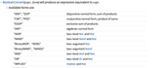 "DNF","SOP" disjunctive normal form, sum of products "CNF","POS" conjunctive normal form, product of sums "ESOP" exclusive sum of products "ANF" algebraic normal form "NOR" two-level Nor and Not "NAND" two-level Nand and Not "BinaryNOR", "NOR2" two-argument Nor "BinaryNAND", "NAND2" two-argument Nand "AND" two-level And and Not "OR" two-level Or and Not "IMPLIES" Implies and Not "ITE","IF" If and constants "BFF" BooleanFunction form "BDT" Boolean decision tree - The expression expr can contain any Boolean or logical functions, including BooleanFunction, BooleanCountingFunction, etc.