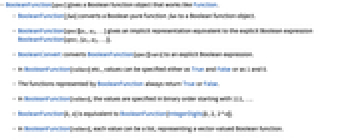 - BooleanFunction[spec] gives a Boolean function object that works like Function.