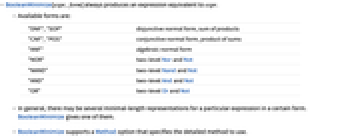 "DNF","SOP" disjunctive normal form, sum of products "CNF","POS" conjunctive normal form, product of sums "ANF" algebraic normal form "NOR" two-level Nor and Not "NAND" two-level Nand and Not "AND" two-level And and Not "OR" two-level Or and Not - In general, there may be several minimal-length representations for a particular expression in a certain form. BooleanMinimize gives one of them.