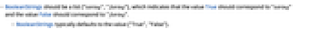 - BooleanStrings should be a list {"tstring","fstring"}, which indicates that the value True should correspond to "tstring" and the value False should correspond to "fstring".
