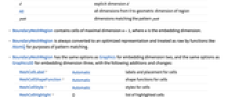 d explicit dimension d All all dimensions from 0 to geometric dimension of region patt dimensions matching the pattern patt - BoundaryMeshRegion contains cells of maximal dimension n-1, where n is the embedding dimension.