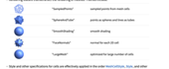 MeshCellLabel Automatic labels and placement for cells MeshCellShapeFunction Automatic shape functions for cells MeshCellStyle Automatic styles for cells MeshCellHighlight {} list of highlighted cells MeshCellMarker 0 integer markers for cells PlotTheme $PlotTheme overall theme for the mesh - Possible settings for PlotTheme include common base themes, font features themes, and size features themes.
