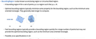 . - Optimal bounding regions typically minimize some property for the bounding region, such as the minimum area oriented rectangle. They generally take longer to compute.