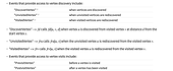 "DiscoverVertex" when vertices are discovered "UnvisitedVertex" when unvisited vertices are rediscovered "VisitedVertex" when visited vertices are rediscovered - "DiscoverVertex"->fd calls fd[u,v,d] when vertex u is discovered from visited vertex v at distance d from the start vertex s.