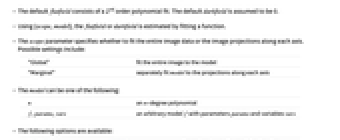 "Global" fit the entire image to the model "Marginal" separately fit model to the projections along each axis - The model can be one of the following: