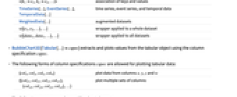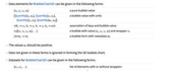 {e1,e2,…} list of elements with or without wrappers <|k1e1,k2e2,…|> association of keys and values TimeSeries[…],EventSeries[…],TemporalData[…] time series, event series, and temporal data WeightedData[…] augmented datasets w[{e1,e2,…},…] wrapper applied to a whole dataset w[{data1,data1,…},…] wrapper applied to all datasets - BubbleChart3D[Tabular[…]cspec] extracts and plots values from the tabular object using the column specification cspec.