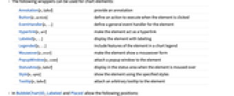 Annotation[e,label] provide an annotation Button[e,action] define an action to execute when the element is clicked EventHandler[e,…] define a general event handler for the element Hyperlink[e,uri] make the element act as a hyperlink Labeled[e,…] display the element with labeling Legended[e,…] include features of the element in a chart legend Mouseover[e,over] make the element show a mouseover form PopupWindow[e,cont] attach a popup window to the element StatusArea[e,label] display in the status area when the element is moused over Style[e,opts] show the element using the specified styles Tooltip[e,label] attach an arbitrary tooltip to the element - In BubbleChart3D, Labeled and Placed allow the following positions:
