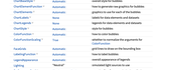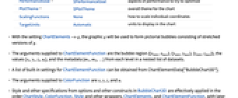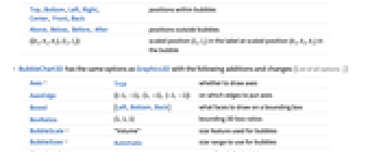 AlignmentPoint Center the default point in the graphic to align with AspectRatio Automatic ratio of height to width Axes True whether to draw axes AxesEdge {{-1, -1}, {1, -1}, {-1, -1}} on which edges to put axes AxesLabel None axes labels AxesOrigin Automatic where axes should cross AxesStyle {} graphics directives to specify the style for axes Background None background color for the plot BaselinePosition Automatic how to align with a surrounding text baseline BaseStyle {} base style specifications for the graphic Boxed {Left,Bottom,Back} what faces to draw on a bounding box BoxRatios {1,1,1} bounding 3D box ratios BoxStyle {} style specifications for the box BubbleScale "Volume" size feature used for bubbles BubbleSizes Automatic size range to use for bubbles ChartBaseStyle Automatic overall style for bubbles ChartElementFunction Automatic how to generate raw graphics for bubbles ChartElements Automatic graphics to use for each of the bubbles ChartLabels None labels for data elements and datasets ChartLegends None legends for data elements and datasets ChartStyle Automatic style for bubbles ClipPlanes None clipping planes ClipPlanesStyle Automatic style specifications for clipping planes ColorFunction Automatic how to color bubbles ColorFunctionScaling True whether to normalize the arguments for ColorFunction ContentSelectable Automatic whether to allow contents to be selected ControllerLinking False when to link to external rotation controllers ControllerPath Automatic what external controllers to try to use Epilog {} 2D graphics primitives to be rendered after the main plot FaceGrids Automatic grid lines to draw on the bounding box FaceGridsStyle {} style specifications for face grids FormatType TraditionalForm default format type for text ImageMargins 0. the margins to leave around the graphic ImagePadding All what extra padding to allow for labels, etc. ImageSize Automatic absolute size at which to render the graphic LabelingFunction Automatic how to label bubbles LabelStyle {} style specifications for labels LegendAppearance Automatic overall appearance of legends Lighting "Neutral" simulated light sources to use Method Automatic details of 3D graphics methods to use PerformanceGoal $PerformanceGoal aspects of performance to try to optimize PlotInteractivity $PlotInteractivity whether to allow interactive elements PlotLabel None a label for the plot PlotRange All range of values to include PlotRangePadding Automatic how much to pad the range of values PlotRegion Automatic final display region to be filled PlotTheme $PlotTheme overall theme for the chart PreserveImageOptions Automatic whether to preserve image options when displaying new versions of the same graphic Prolog {} 2D graphics primitives to be rendered before the main plot RotationAction "Fit" how to render after interactive rotation ScalingFunctions None how to scale individual coordinates SphericalRegion Automatic whether to make the circumscribing sphere fit in the final display area TargetUnits Automatic units to display in the chart Ticks Automatic specification for ticks TicksStyle {} style specification for ticks TouchscreenAutoZoom False whether to zoom to fullscreen when activated on a touchscreen ViewAngle Automatic angle of the field of view ViewCenter Automatic point to display at the center ViewMatrix Automatic explicit transformation matrix ViewPoint {1.3,-2.4,2.} viewing position ViewProjection Automatic projection method for rendering objects distant from the viewer ViewRange All range of viewing distances to include ViewVector Automatic position and direction of a simulated camera ViewVertical {0,0,1} direction to make vertical