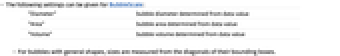 "Diameter" bubble diameter determined from data value "Area" bubble area determined from data value "Volume" bubble volume determined from data value - For bubbles with general shapes, sizes are measured from the diagonals of their bounding boxes.
