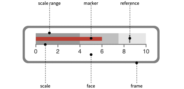 Wolfram Language. 2012. "BulletGauge." Wolfram Language & System Documentation Center. Wolfram Research. Last Modified 2014. https://reference.wolfram.com/language/ref/BulletGauge.html.