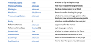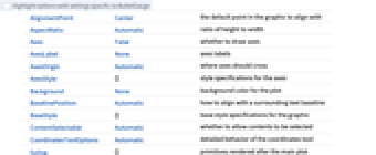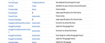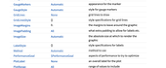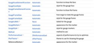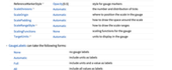 AlignmentPoint Center the default point in the graphic to align with AspectRatio Automatic ratio of height to width Axes False whether to draw axes AxesLabel None axes labels AxesOrigin Automatic where axes should cross AxesStyle {} style specifications for the axes Background None background color for the plot BaselinePosition Automatic how to align with a surrounding text baseline BaseStyle {} base style specifications for the graphic ContentSelectable Automatic whether to allow contents to be selected CoordinatesToolOptions Automatic detailed behavior of the coordinates tool Epilog {} primitives rendered after the main plot FormatType TraditionalForm the default format type for text Frame False whether to put a frame around the plot FrameLabel None frame labels FrameStyle {} style specifications for the frame FrameTicks Automatic frame ticks FrameTicksStyle {} style specifications for frame ticks GaugeFaceElementFunction Automatic function to draw the face GaugeFaceStyle Automatic style for the gauge face GaugeFrameElementFunction Automatic function to draw the frame GaugeFrameSize Automatic how large to make the gauge frame GaugeFrameStyle Automatic style for the gauge frame GaugeLabels None labels for the gauge GaugeMarkers Automatic appearance for the marker GaugeStyle Automatic style for gauge markers GridLines None grid lines to draw GridLinesStyle {} style specifications for grid lines ImageMargins 0. the margins to leave around the graphic ImagePadding All what extra padding to allow for labels etc. ImageSize Automatic the absolute size at which to render the graphic LabelStyle {} style specifications for labels Method Automatic method to use PerformanceGoal $PerformanceGoal aspects of performance to try to optimize PlotLabel None an overall label for the plot PlotRange All range of values to include PlotRangeClipping False whether to clip at the plot range PlotRangePadding Automatic how much to pad the range of values PlotRegion Automatic the final display region to be filled PlotTheme $PlotTheme theme to use for drawing the gauge PreserveImageOptions Automatic whether to preserve image options when displaying new versions of the same graphic Prolog {} primitives rendered before the main plot ReferenceMarkers Automatic appearance for the marker ReferenceMarkerStyle Opacity[0.5] style for gauge markers RotateLabel True whether to rotate y labels on the frame ScaleDivisions Automatic the number and distribution of ticks ScaleOrigin Automatic where to position the scale in the gauge ScalePadding Automatic how to draw the space around the scale ScaleRangeStyle Automatic how to draw the scale ranges ScalingFunctions None scaling functions for the gauge TargetUnits Automatic units to display in the gauge Ticks Automatic axes ticks TicksStyle {} style specifications for axes ticks