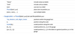 None no gauge labels Automatic include units as labels Full include units and a value as labels All include all values as labels "Value" include values as labels "Unit" include units as labels label use label as a label Placed[label,pos] place label at position pos {label1,label2,…} use multiple labels - GaugeLabels->Placed[label,pos] can use the positions pos: