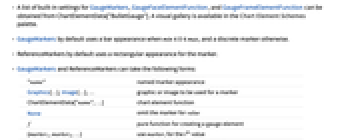 "name" named marker appearance Graphics[…],Image[…],… graphic or image to be used for a marker ChartElementData["name",…] chart element function None omit the marker for value f pure function for creating a gauge element {marker1,marker2,…} use markeri for the i