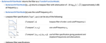 - ButterworthFilterModel[{n,ω}] returns a lowpass filter with attenuation of