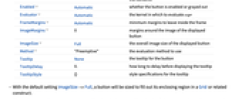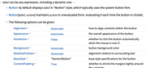 Alignment Automatic how to align contents within the button Appearance Automatic the overall appearance of the button AutoAction False whether to click the button automatically when the mouse is over it Background Automatic button background color BaselinePosition Automatic alignment relative to surrounding text BaseStyle "GenericButton" base style specifications for the button ContentPadding True whether to shrink the margins tightly around the contents Enabled Automatic whether the button is enabled or grayed out Evaluator Automatic the kernel in which to evaluate expr FrameMargins Automatic minimum margins to leave inside the frame ImageMargins 0 margins around the image of the displayed button ImageSize Full the overall image size of the displayed button Method "Preemptive" the evaluation method to use Tooltip None the tooltip for the button TooltipDelay 0.` how long to delay before displaying the tooltip TooltipStyle {} style specifications for the tooltip - With the default setting ImageSize->Full, a button will be sized to fill out its enclosing region in a Grid or related construct.