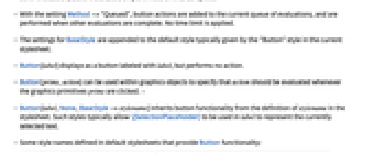 - With the setting Method->"Queued", button actions are added to the current queue of evaluations, and are performed when other evaluations are complete. No time limit is applied.