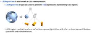 - A CSG region tree is a tree where leaf vertices represent primitives and other vertices represent Boolean operations and transformations.