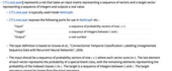 - CTCLossLayer[] represents a net that takes an input matrix representing a sequence of vectors and a target vector representing a sequence of integers and outputs a real value.