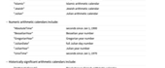 "AbsoluteTime" seconds since Jan 1, 1900 "BesselianYear" Besselian year number "GregorianYear" Gregorian year number "JulianDate" full Julian day number "JulianYear" Julian year number "UnixTime" seconds since Jan 1, 1970 - Historically significant arithmetic calendars include:
