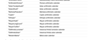 "ArithmeticFrench" Revolutionary French arithmetic calendar "ArithmeticPersian" Persian arithmetic calendar "AztecTonalpohualli" Aztec arithmetic calendar "AztecXihuitl" Aztec arithmetic calendar "BalinesePawukon" Balinese arithmetic calendar "Coptic" Coptic arithmetic calendar "Ethiopic" Ethiopic arithmetic calendar "MayanHaab" Mayan arithmetic calendar "MayanLongCount" Mayan arithmetic calendar "MayanTzolkin" Mayan arithmetic calendar "OldHinduLunisolar" historical Hindu lunisolar calendar "OldHinduSolar" historical Hindu solar calendar "WesternBahai" Bahai solar calendar - Recently proposed arithmetic calendars include: