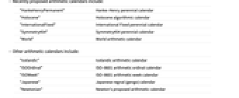 "HankeHenryPermanent" Hanke–Henry perennial calendar "Holocene" Holocene algorithmic calendar "InternationalFixed" International Fixed perennial calendar "Symmetry454" Symmetry454 perennial calendar "World" World arithmetic calendar - Other arithmetic calendars include: