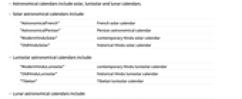 "AstronomicalFrench" French solar calendar "AstronomicalPersian" Persian astronomical calendar "ModernHinduSolar" contemporary Hindu solar calendar "OldHinduSolar" historical Hindu solar calendar - Lunisolar astronomical calendars include: