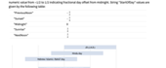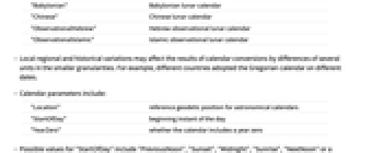 "Location" reference geodetic position for astronomical calendars "StartOfDay" beginning instant of the day "YearZero" whether the calendar includes a year zero - Possible values for "StartOfDay" include "PreviousNoon", "Sunset", "Midnight", "Sunrise", "NextNoon" or a numeric value from −1/2 to 1/2 indicating fractional day offset from midnight. String "StartOfDay" values are given by the following table: