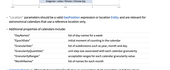 - "Location" parameters should be a valid GeoPosition expression or location Entity and are relevant for astronomical calendars that use a reference location only.