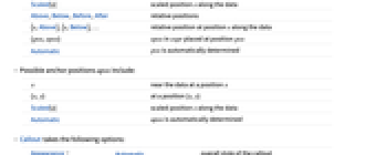 x near the data at a position x {x,y} at a position {x,y} Scaled[s] scaled position s along the data Automatic apos is automatically determined - Callout takes the following options: