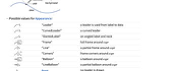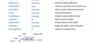 Appearance Automatic overall style of the callout Background Automatic style of the label background CalloutMarker None marker to use for the anchor position apos CalloutStyle Automatic style to use for strokes and knockouts Frame Automatic frame of the label box FrameMargins Automatic margins to leave inside the frame LabelStyle {} style to use for the label LabelVisibility Automatic priority relative to other labels LeaderSize Automatic length and angle to use for the leader RoundingRadius 0 radius for rounded corners - Possible values for Appearance: