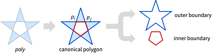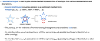- CanonicalizePolygon converts a polygon to an optimized standard form Polygon[{p1,p2,…},{outer1,outer2inner2,…}].
