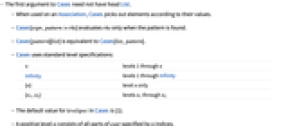 n levels 1 through n Infinity levels 1 through Infinity {n} level n only {n1,n2} levels n1 through n2 - The default value for levelspec in Cases is {1}.