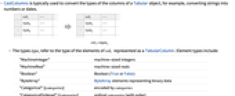 - CastColumns is typically used to convert the types of the columns of a Tabular object, for example, converting strings into numbers or dates.